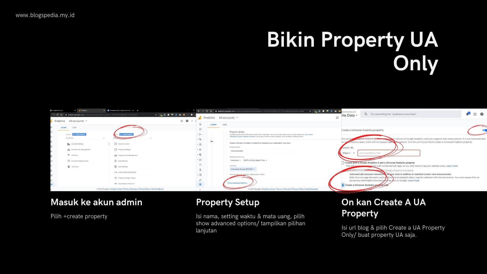 Gampang kok. Sama aja seperti di metode pertama, bedanya sebelum klik next pada proses pembuatan property, munculkan dulu ‘advanced options’. Ternyata ada pilihannya di situ untuk membuat property UA. Ada 2 sub pilihan yang disediakan; apakah mau sekalian pasang UA, atau mau pasang UA saja.