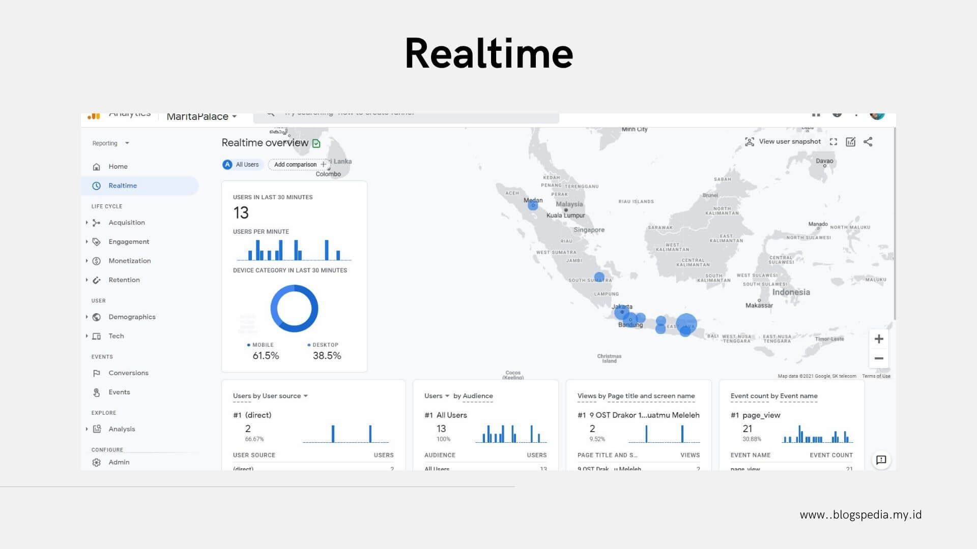 Fitur ini memberikan laporan lebih lengkap tentang pengguna aktif dalam kurun waktu 30 menit. Di GA4, laporan realtime ini ditampilkan langsung dalam 1 halaman. Selain jumlah pengguna, ada laporan postingan apa yang dalam 30 menit terakhir diakses, asal daerah pengguna dari mana, serta sumber traffic (apakah direct link atau organic/ google).