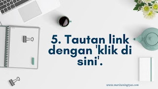 Yang nomor lima ini juga sering MomBlogger Cupu lakukan nih. Ternyata sebaiknya kita memilih kata-kata yang berisi tautan dengan hati-hati. Saat kita menulis artikel dan perlu memasukkan tautan, pertimbangkan bagaimana kita akan menulis kalimat itu, serta di mana kita akan memasukkan tautan itu.