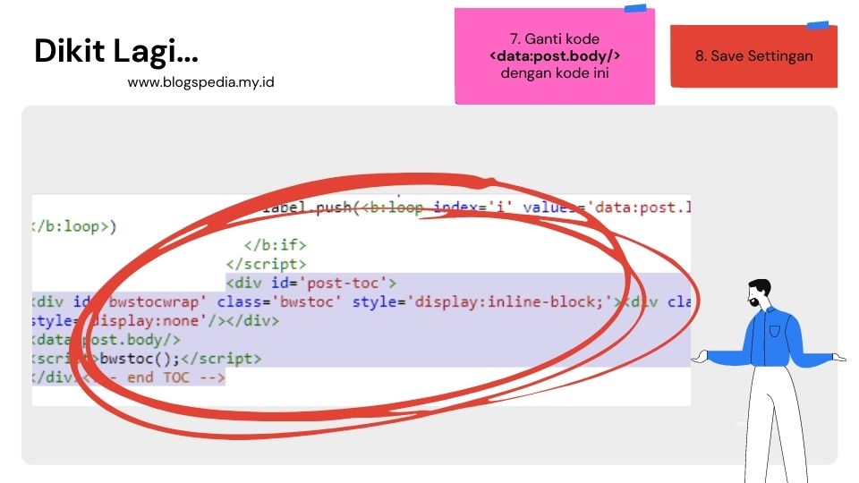 Di beberapa template blogspot bisa jadi ada kode <data:post.body/> lebih dari satu. Waktu menambahkan Table of Contents di blog Marita’s Palace dan Rumah Kita, MomBlogger menemukan dua kode <data:post.body/>,