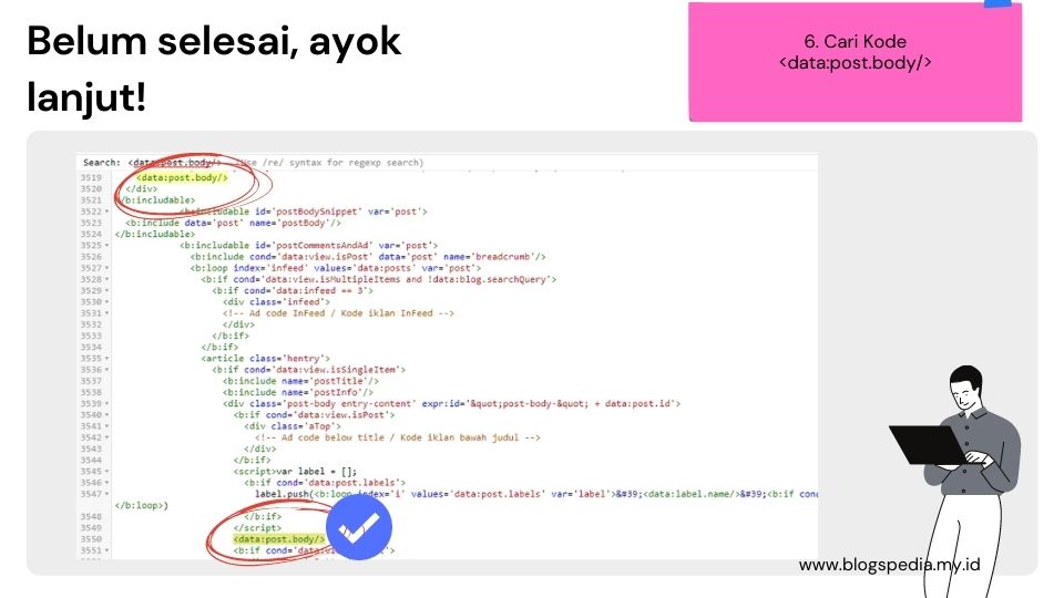 • Berikutnya cari kode <data:post.body/>, lalu ganti/ timpa kode tersebut dengan kode berikut;