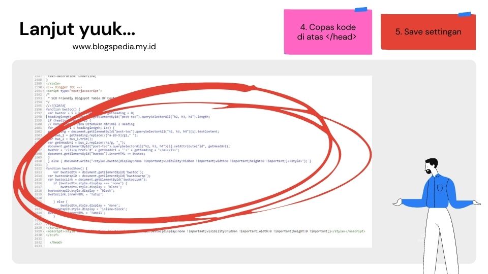 Membuat Table of Contents (TOC) alias daftar isi di dalam artikel blogspot memang susah-susah gampang. Kecuali cupuers membeli atau menginstall template yang memang sudah menyediakan fitur TOC di dalamnya, seperti template yang dipakai Blogspedia. Jadi nggak perlu setting macam-macam lagi. Tinggal nambahin sebaris kode di dalam html setiap mau posting artikel, udah deh muncul TOC-nya.