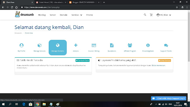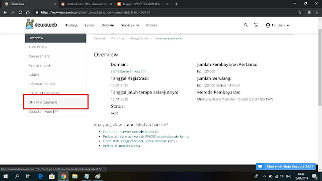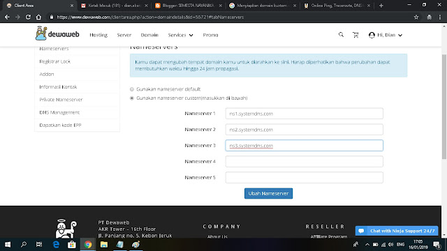 Terkadang proses setting sudah beres, namun domain masih belum dibuka karena dalam proses propagasi. Tunggu saja sekitar 30 menit sampai 1×24 jam. Jika menemukan kendala, kita bisa chat dengan NINJA di Dewaweb yang bakal bantu kita mengecek apa settingan kita sudah benar. Helpful banget kok para Ninjanya.
