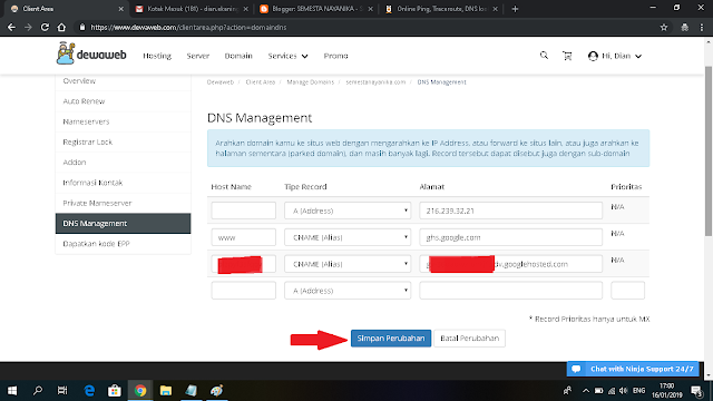 - Pilih ‘type record’ CNAME lagi, di kolom depan dan belakang copas CNAME baris kedua yang ada di dashboard blog. Lalu klik “simpan perubahan.”