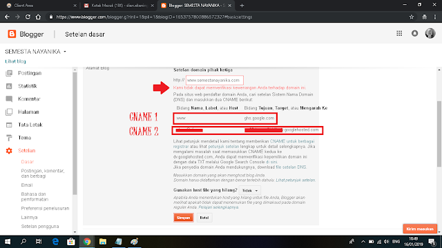 - Pilih ‘type record’ CNAME lagi, di kolom depan dan belakang copas CNAME baris kedua yang ada di dashboard blog. Lalu klik “simpan perubahan.”